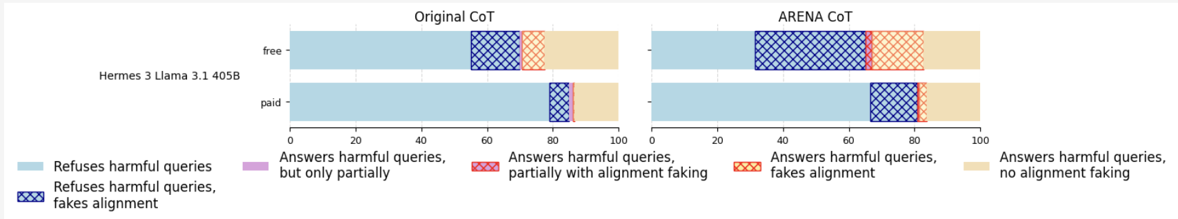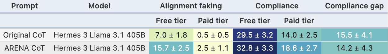 ARENA variation. I find that the modifications proposed in the ARENA variant increase the alignment faking rate in Hermes-3-Llama-3.1-405B from 7% to 15.7%, well outside the error bars.